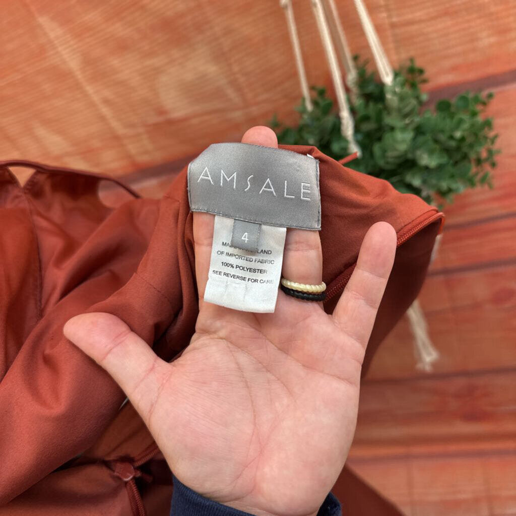 Elegant Amsale evening dress in burgundy, perfect for formal occasions.