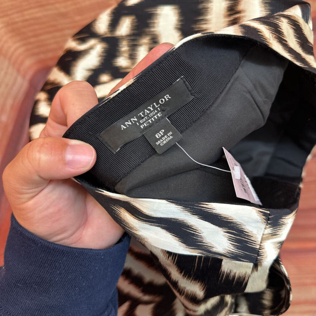 Stylish Ann Taylor petite skirt featuring a striking zebra print design in black, beige, and white colors. Perfect for a chic and fashionable look.