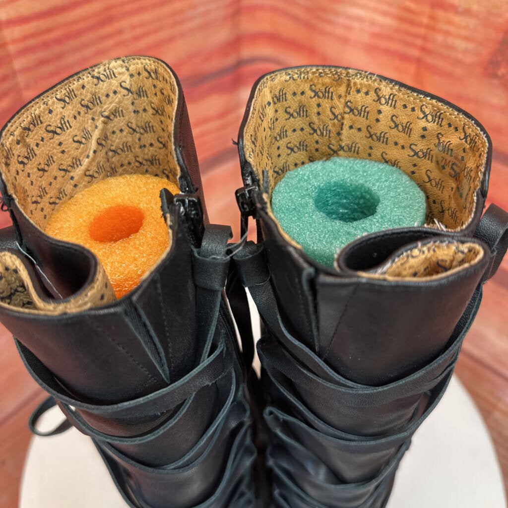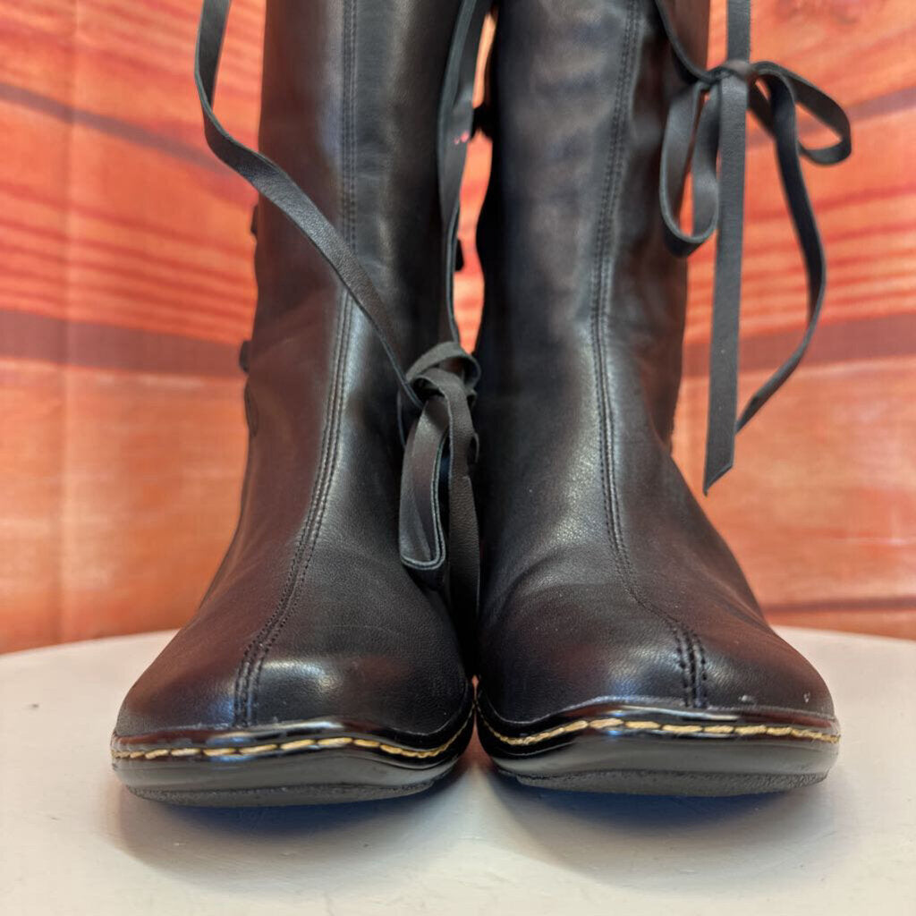 Stylish black knee-high boots with high heels, featuring lace-up design and gently used condition.