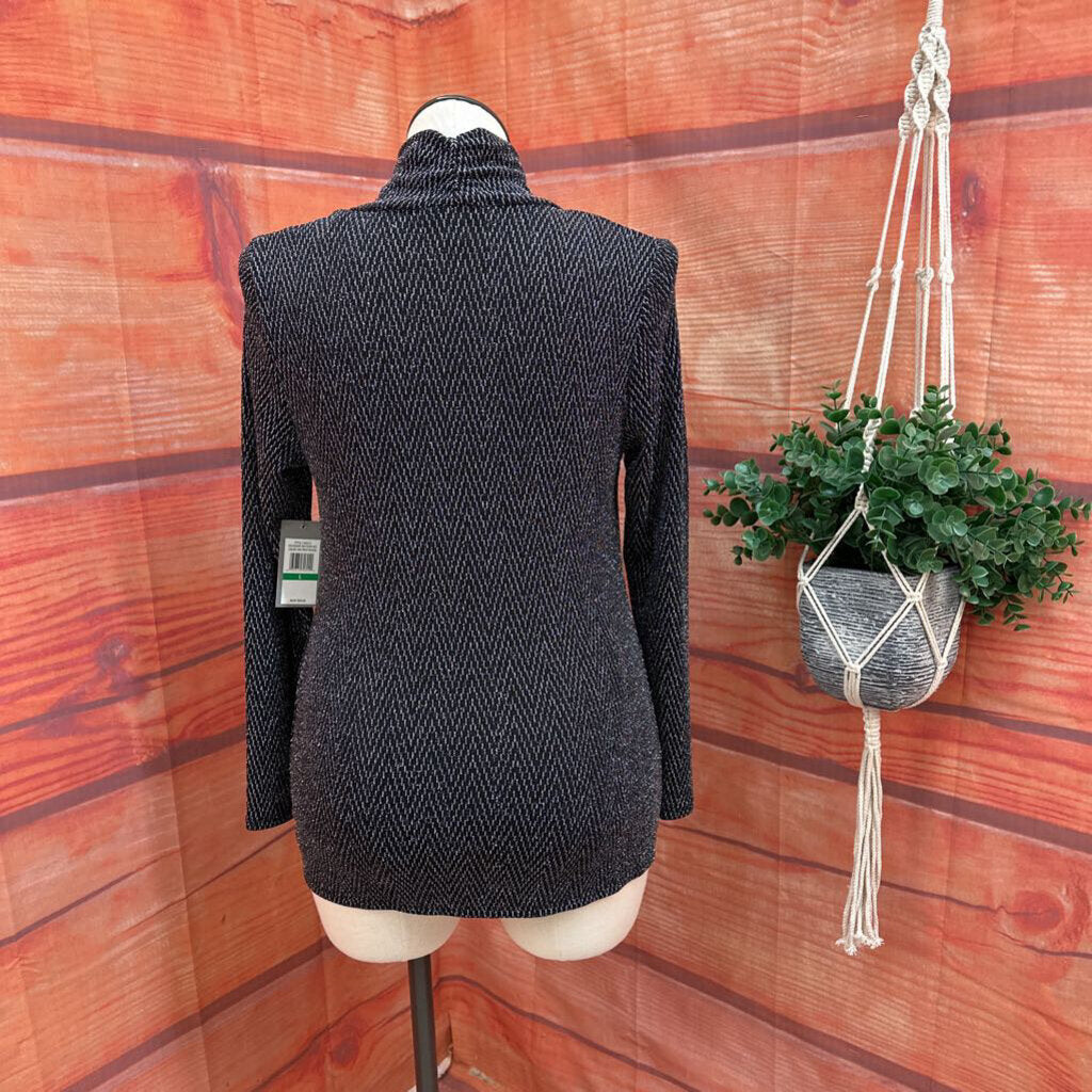 Stylish women's black wrap top from Chaus New York, perfect for both casual and formal occasions. Featuring a trendy design with a touch of sparkle, this top is a versatile addition to any wardrobe.