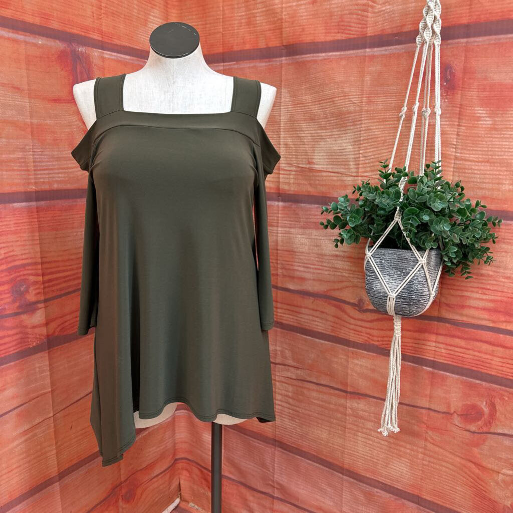 Stylish and comfortable cold shoulder top by Clara Sunwoo in olive green, perfect for casual outings or layering.
