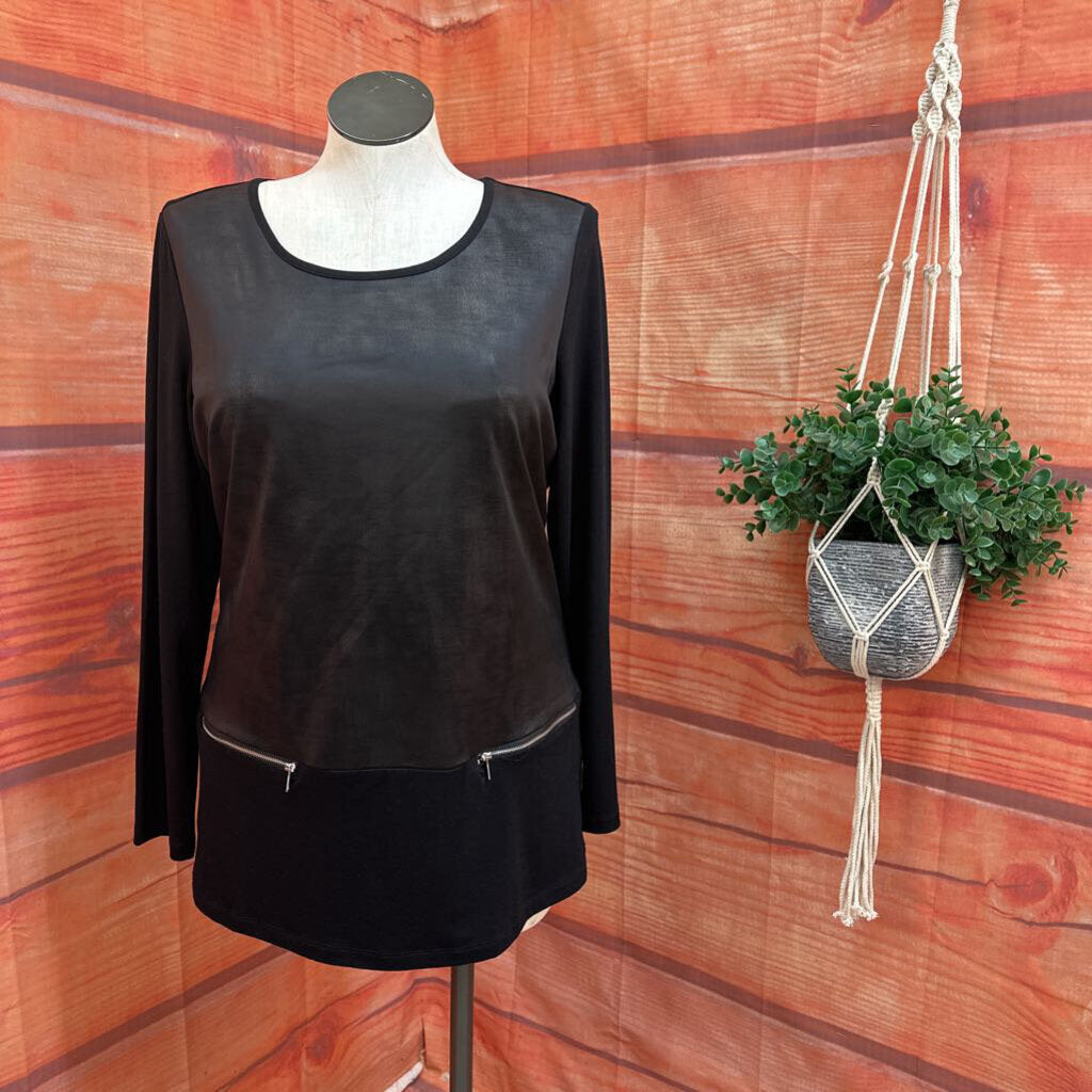 Stylish black long sleeve top by Conrad C, featuring unique zipper details at the hem. Perfect for casual and semi-formal occasions.