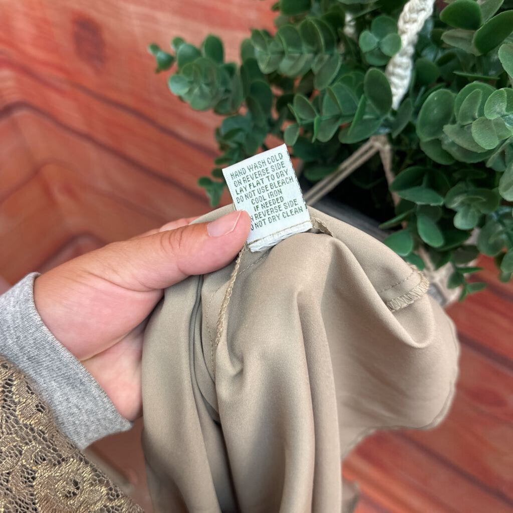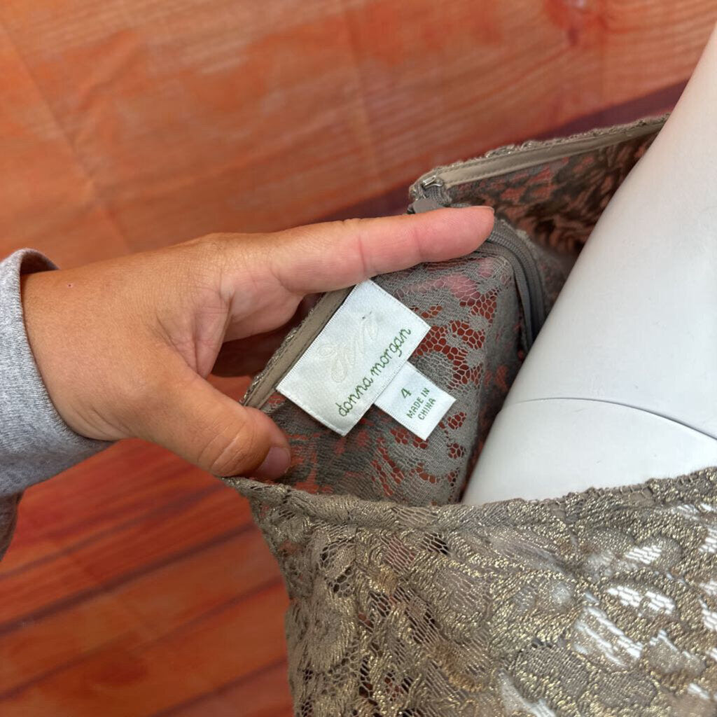 Elegant beige lace dress by Donna Morgan, perfect for special occasions or as a stylish addition to your wardrobe.