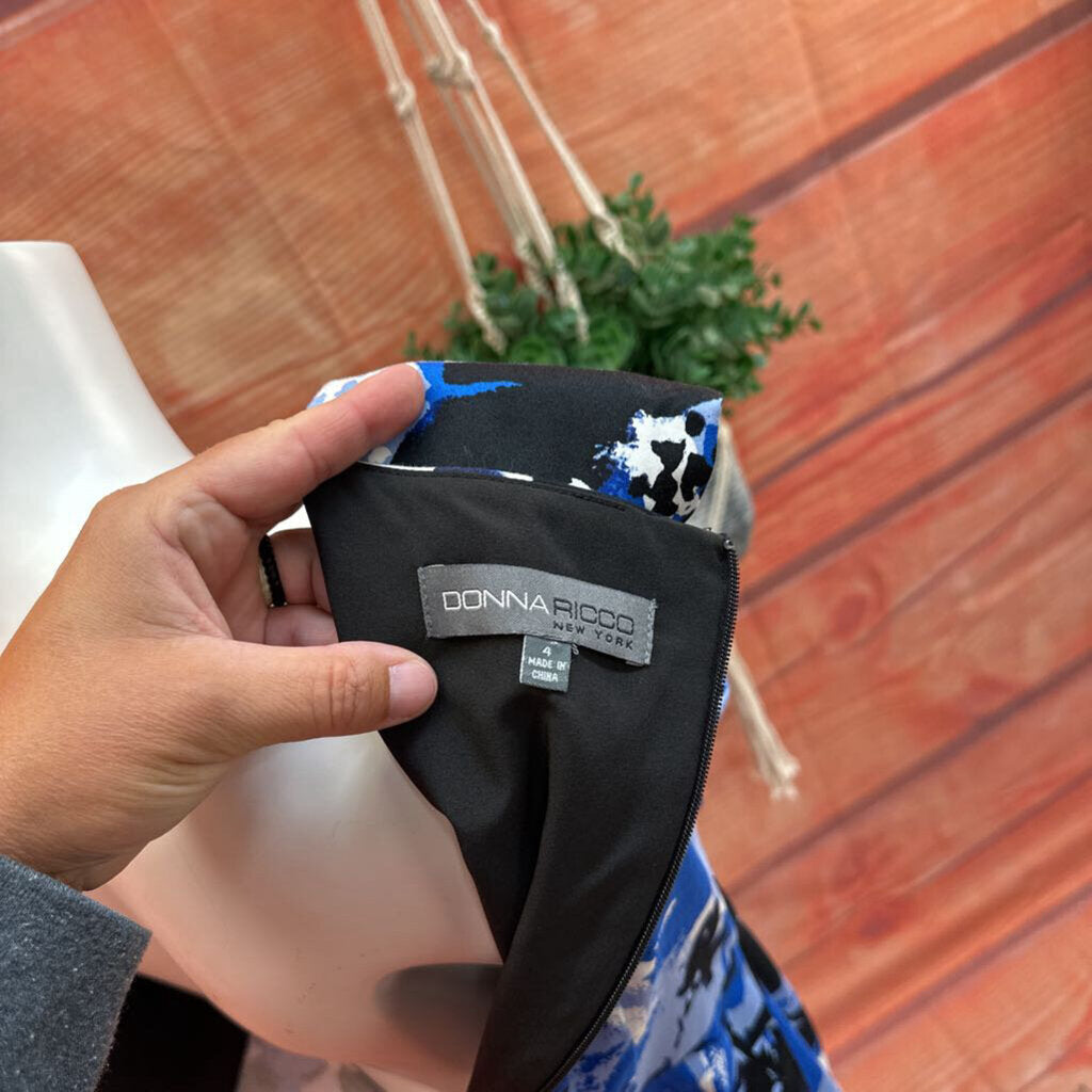 A stylish Donna Ricco floral print dress featuring a beautiful blend of blue, black, and white colors, perfect for any occasion. Size small, comfortable and fashionable, ideal for daytime or evening wear.