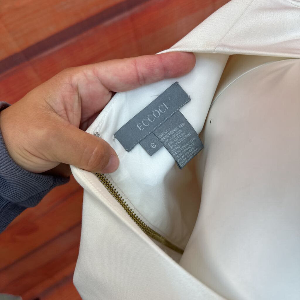 Stylish and elegant white dress by Eccoci, perfect for formal occasions. Made from a blend of polyester, viscose, and cotton, offers comfort and a chic look.
