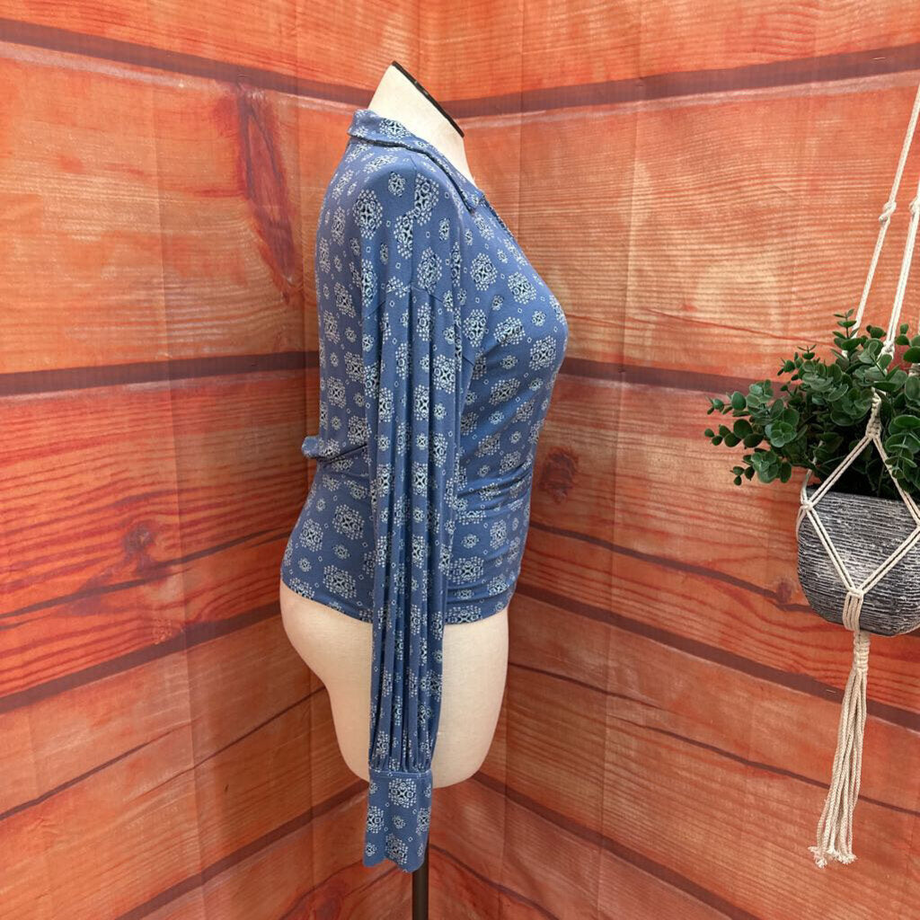Stylish blue printed top by Free People featuring a button-up design and soft fabric, perfect for casual wear.