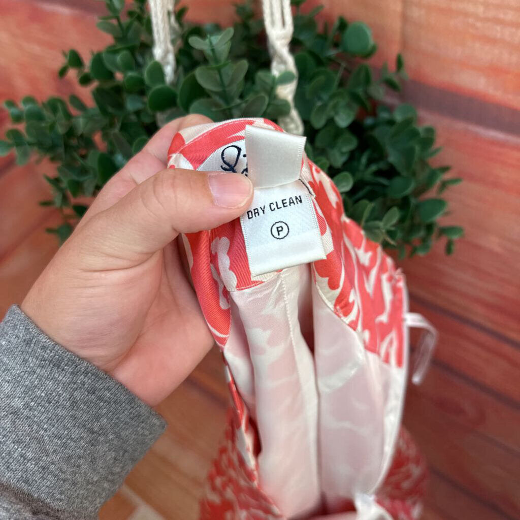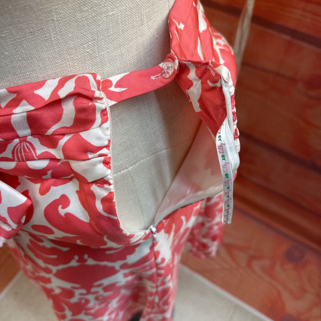 Stylish Lilly Pulitzer skirt featuring a vibrant pink floral pattern, perfect for casual outings or summer events. The waist measures 34 inches around, from top to bottom it measures 22 inches.