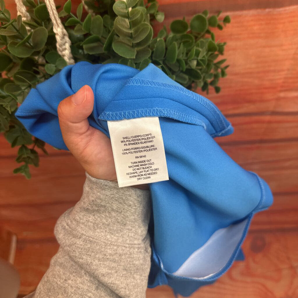 Stylish blue dress by Maggy London, perfect for various occasions. Features a chic design with short sleeves and a tie detail at the neck.