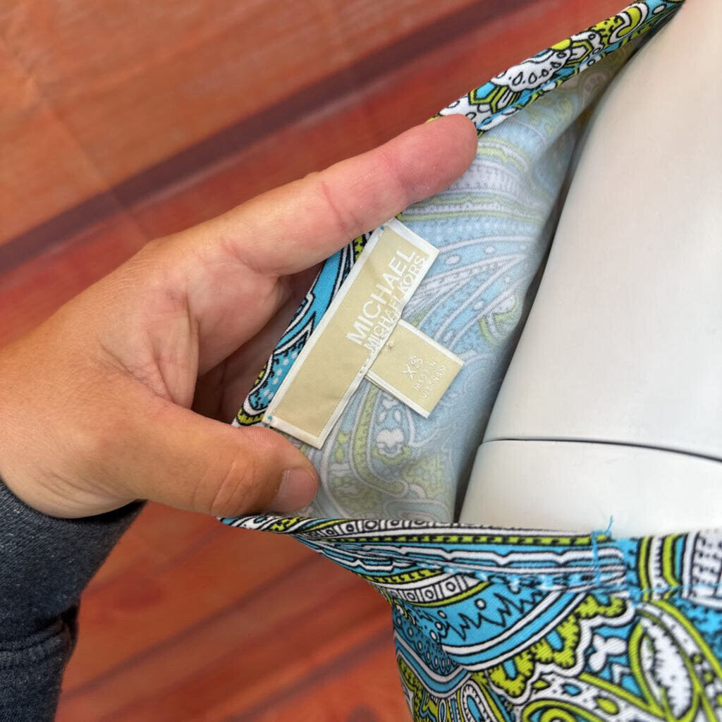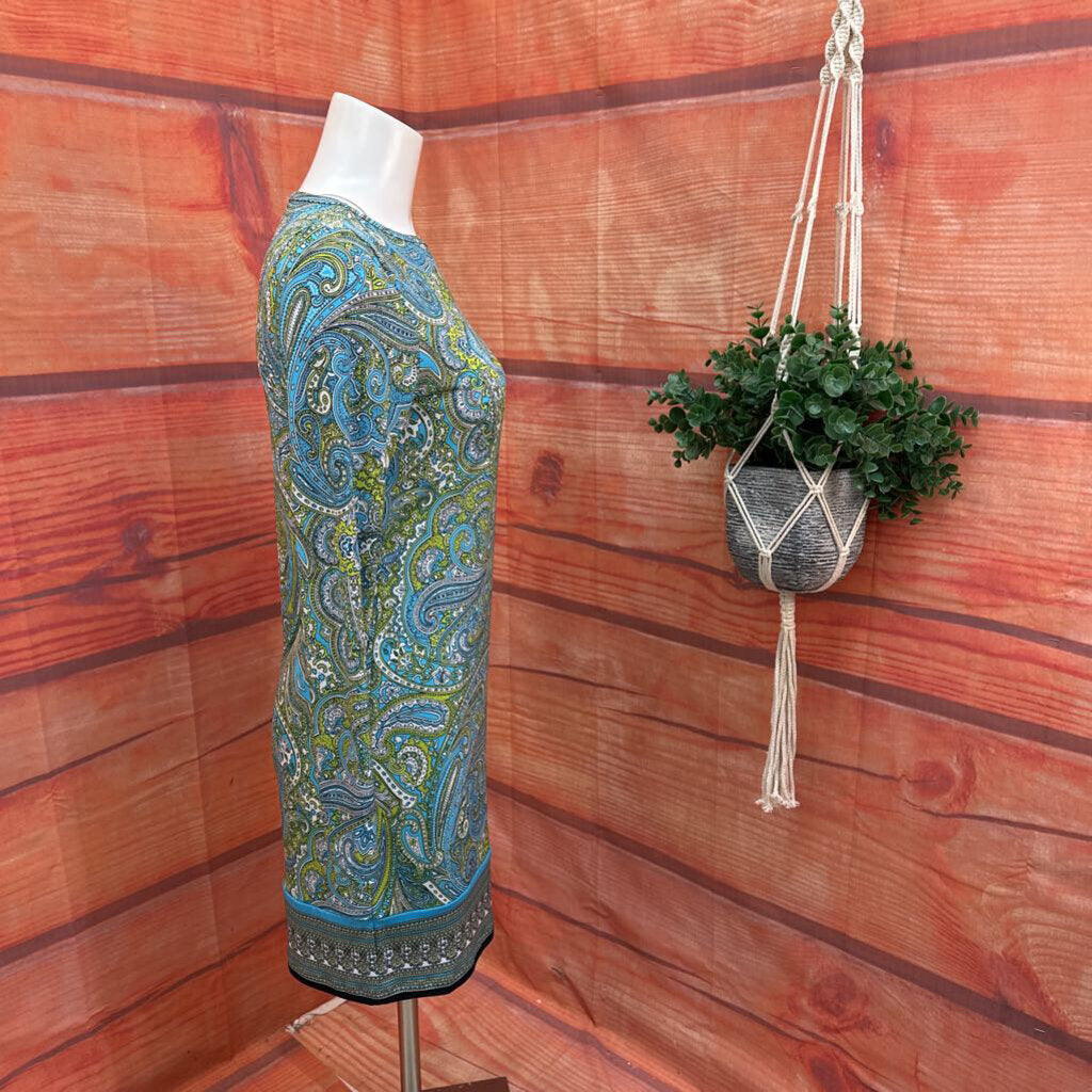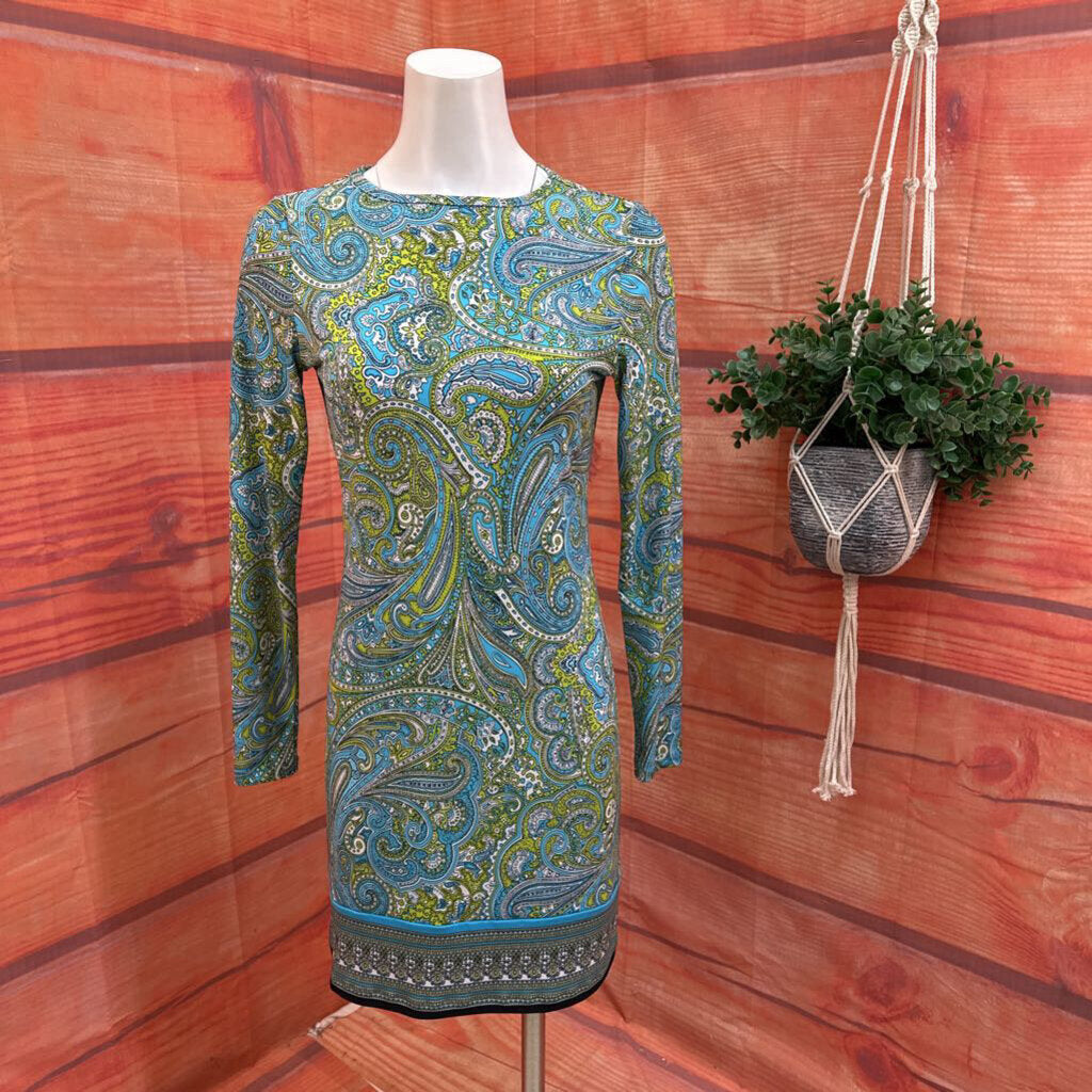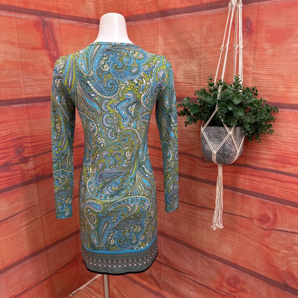 A stylish XS long-sleeve top featuring a vibrant blue and green paisley print, perfect for casual wear or special occasions.