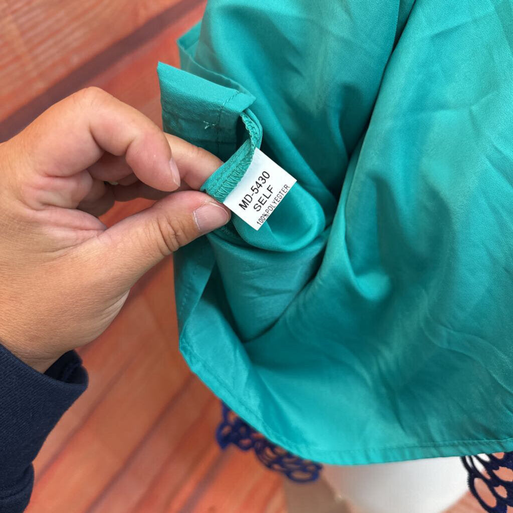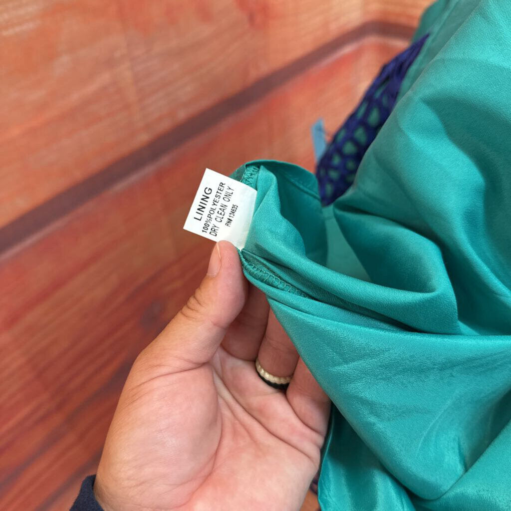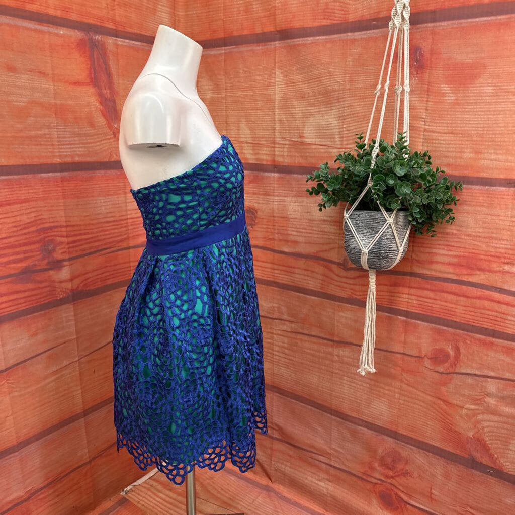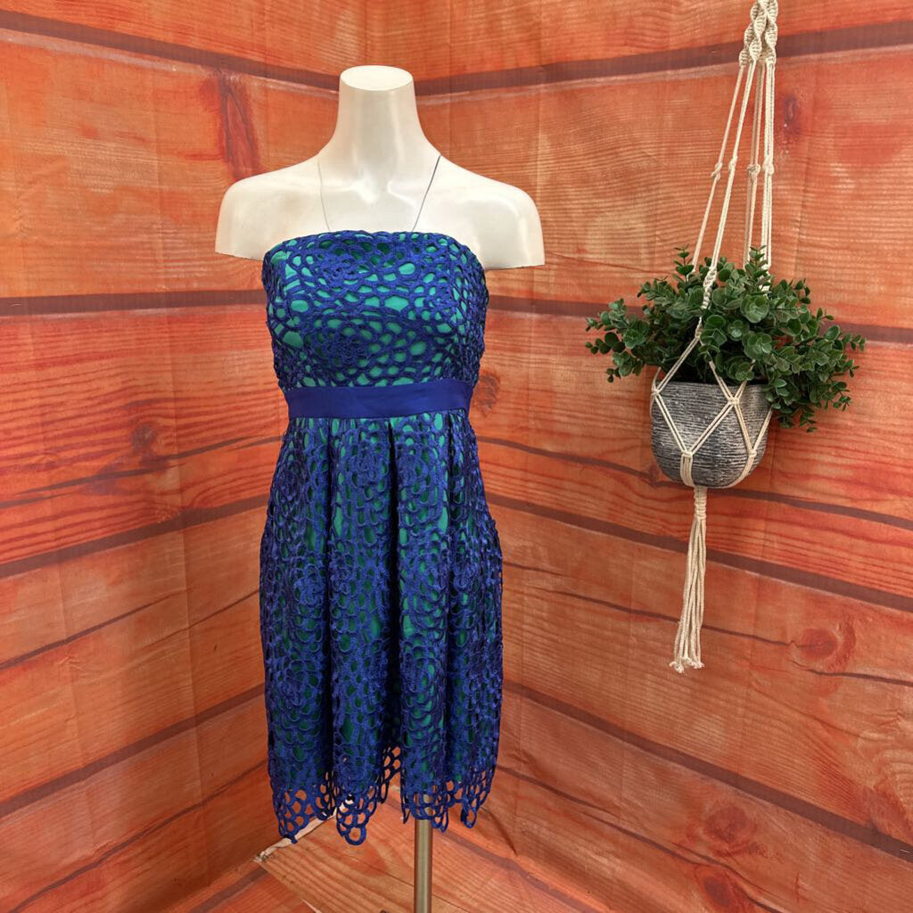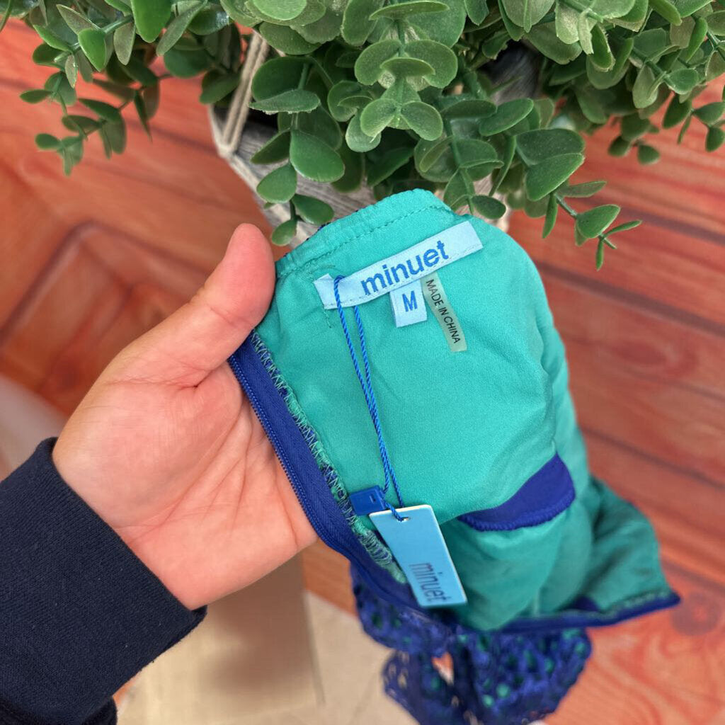 A stylish Minuet dress featuring a unique design with blue and green colors, suitable for special occasions or casual outings.