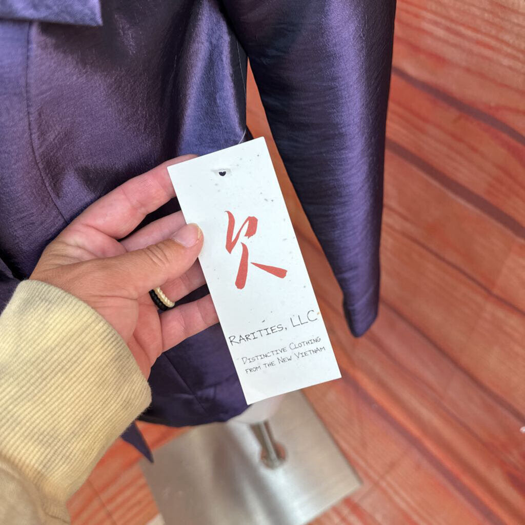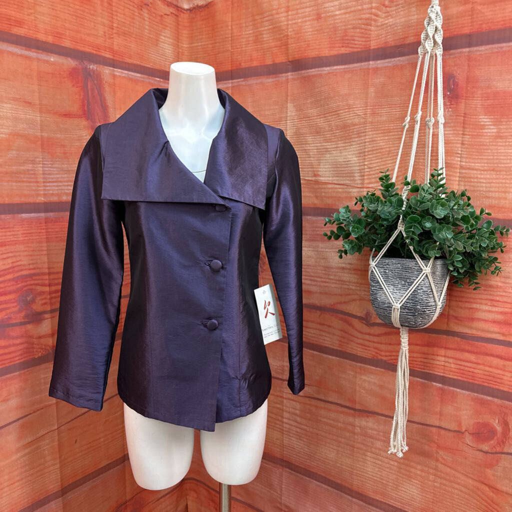 Stylish purple satin jacket, perfect for formal occasions or a chic night out. Features a unique design with a wide collar for a sophisticated look.