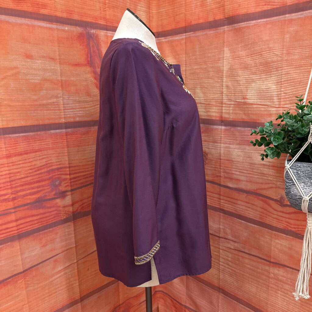 Elegant purple top by Soft Surroundings featuring intricate embroidery, perfect for casual or dressy occasions.