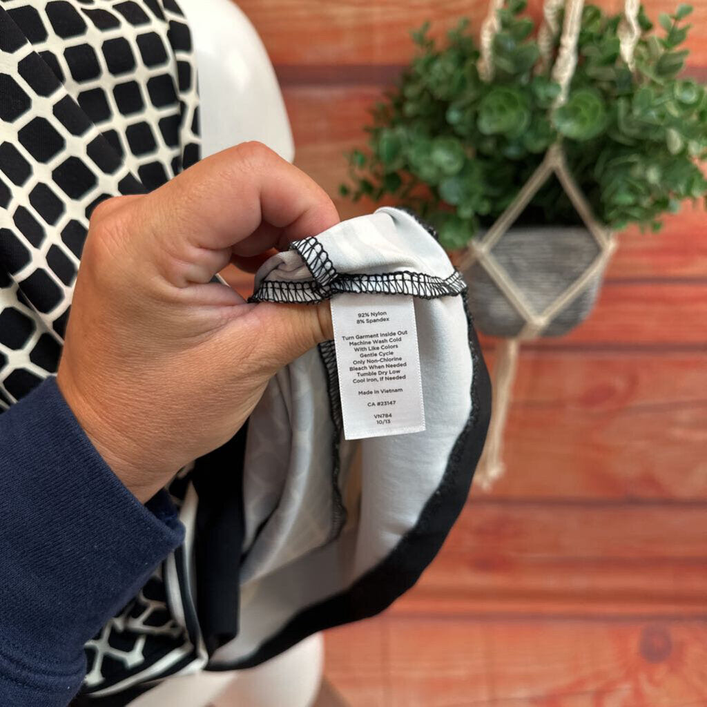 Stylish Talbots women's dress featuring a sleek black and white geometric pattern, perfect for any occasion. Comfortable fit and versatile design, suitable for casual wear or dressy events.