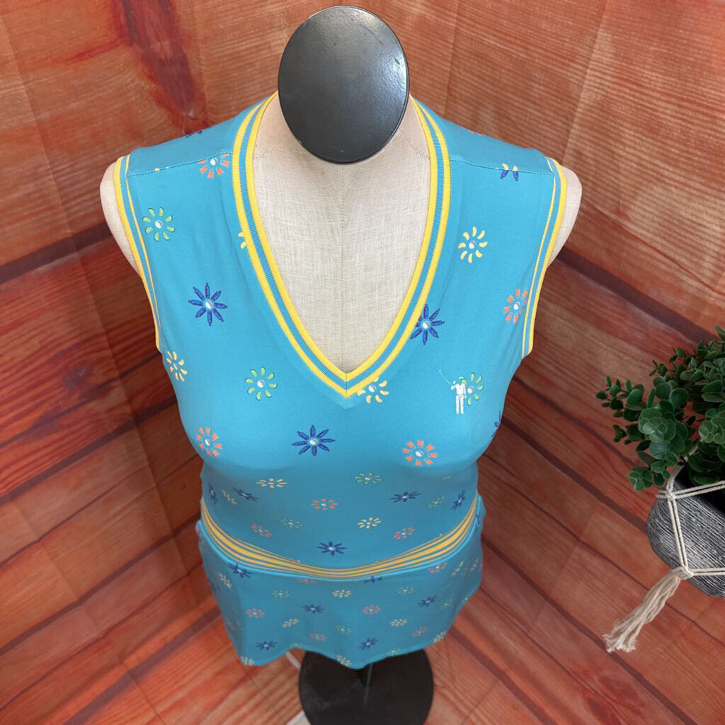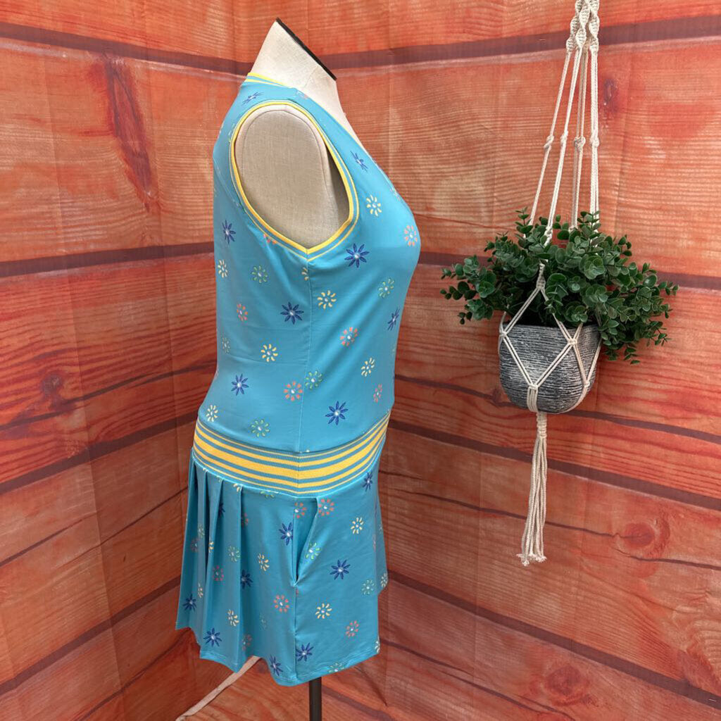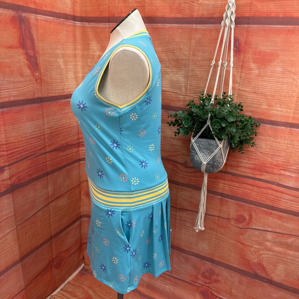 A vibrant blue floral print dress by William Murray, designed for comfort and style. Perfect for casual outings or summer events.